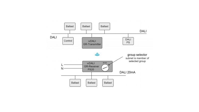 Für die Verbindung werden mindestens je ein Transmitter (Sendeeinheit) und ein Receiver (Empfangseinheit) benötigt. Mit einem Transmitter können auch mehrere DALI-Subkreise (mit jeweils einem Receiver) gesteuert werden.