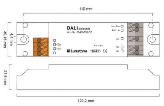 Das Jalousie-Steuermodul verfügt über eine DALI-Adresse und vier programmierbare Vorgänge zum Verstellen des Jalousie-Kippwinkels bzw. Öffnen/Schließen der Jalousie. Die Steuerung des Moduls erfolgt über die DALI-Befehle RECALL MAX oder UP für „Auf“ und RECALL MIN oder DOWN für „Ab“. Der Vorgang hält solange an, bis ein OFF die Motorsteuerung stoppt.