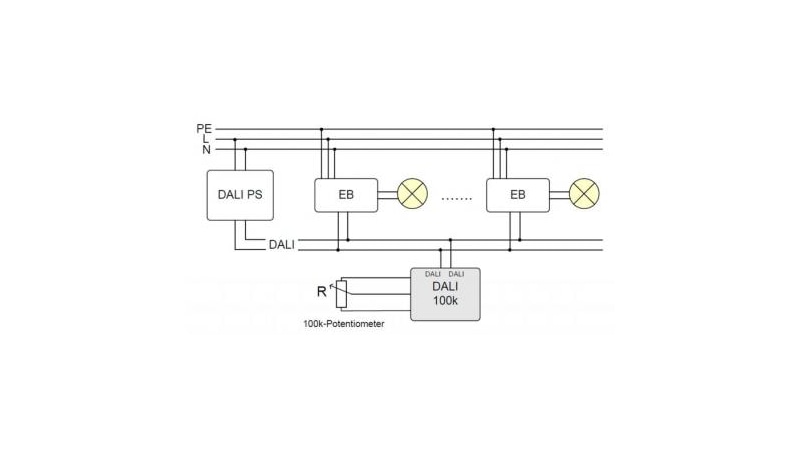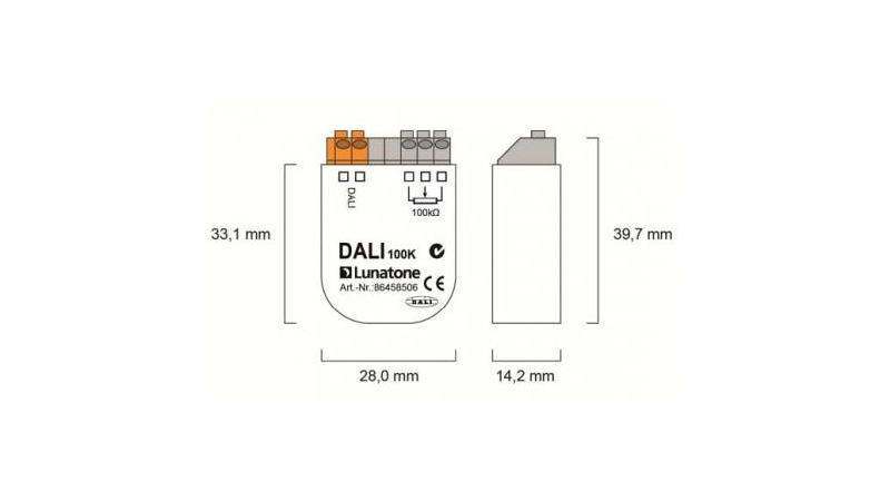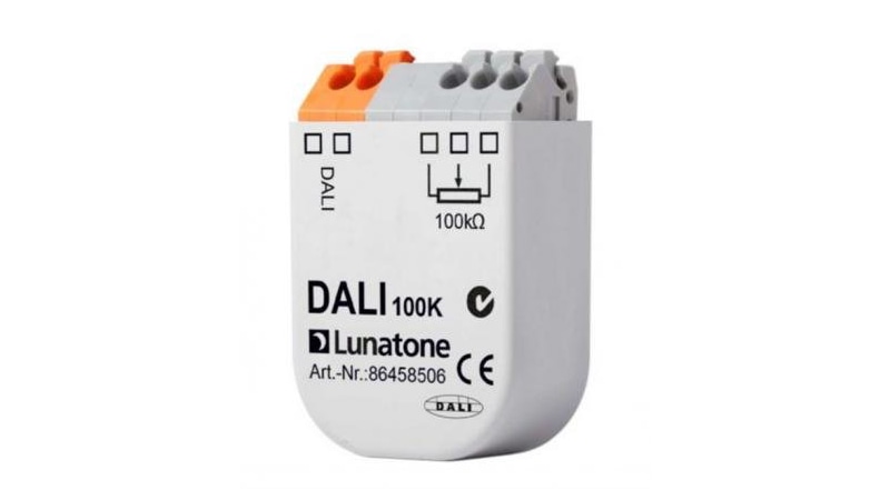 Mithilfe des kompakten DALI Steuermoduls DALI 100k von Lunatone kann ein analoges Signal in ein DALI-Dimmwert umgewandelt werden. Das Modul besitzt einen analogen Eingang zum direkten Anschluss eines Potentiometers mit 100kOhm und ist für den Einbau geeignet. Dazu wird es in einer Unterputzdose direkt hinter dem Potentiometer eingelegt.