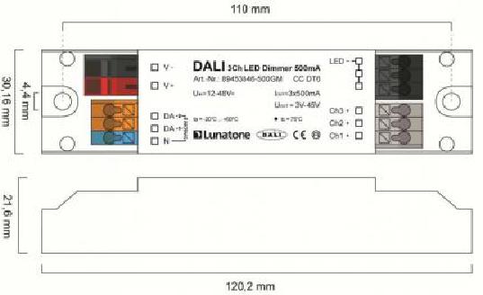Der Lunatone DALI LED-Dimmer besitzt eine umschaltbare PMW-Frequenz (122Hz/244Hz/488Hz/976Hz). Die Versorgungsspannung liegt bei 12V bis 48V DC, die Ausgangsspannung bei 45V DC.