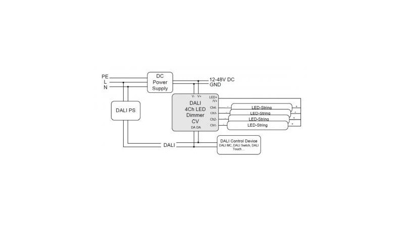 Der Lunatone 4-Kanal Konstantspannung DALI LED-Dimmer DALI 4Ch CV 16A mit maximalen Anschlussströmen von 16A ist zum Ansteuern von Konstantspannungs-LED-Modulen geeignet. Der maximale Anschlussstrom kann beliebig auf die Kanäle verteilt werden.