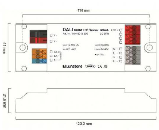 Der Lunatone DALI LED-Dimmer besitzt eine umschaltbare PMW-Frequenz (122Hz/244Hz/488Hz/976Hz). Die Versorgungsspannung liegt bei 12V bis 48V DC, die Ausgangsspannung bei 45V DC.