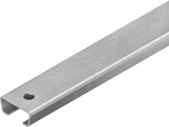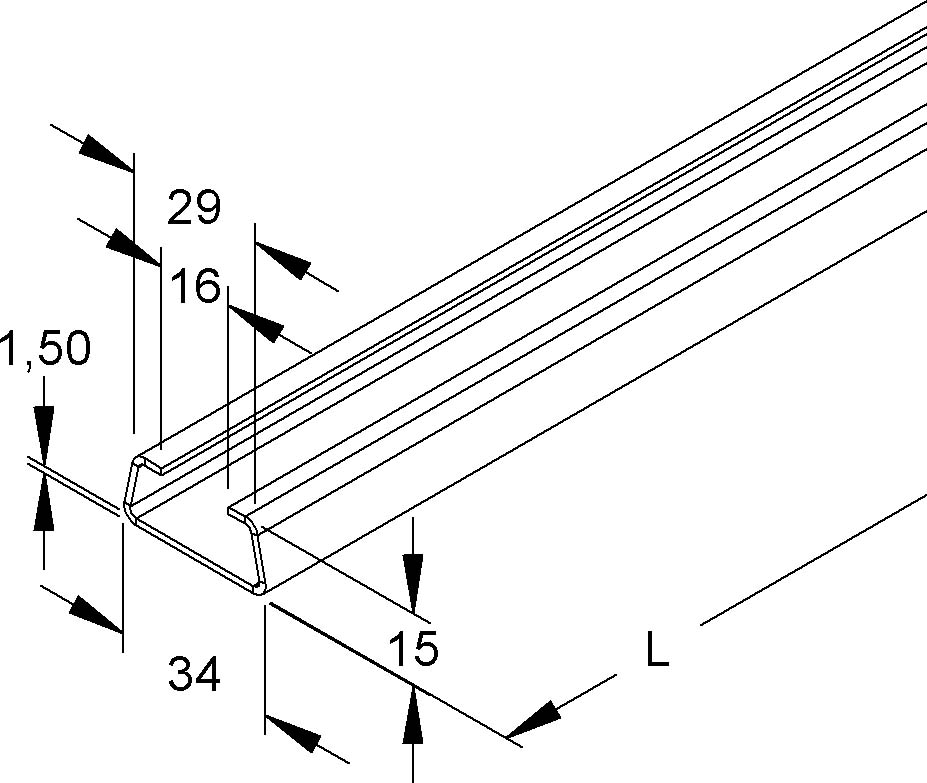Anker-/Profilschiene Modell 2975, C-Profil mit schräg zulaufenden Seiten, ungelocht jedoch mit beidseitig mittiger Tauchlochung zu den Profilenden. Passende Bügelschellen (B... und BK...). Abmessungen (ca. Maße) H x t : 15 x 1,5 mm B auf B1 : 34 auf 29 mm Schlitzweite : 16 mm Tauchlochung : Ø 9 mm Abstand zum Profilende : 15 mm Lieferlänge L : 2000 mm Werkstoff : Stahl, tauchfeuerverzinkt nach DIN EN ISO 1461