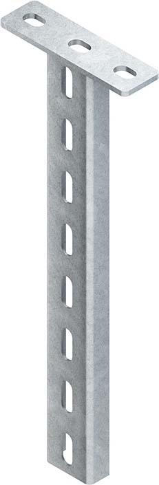 Hängestiel, U-Profil mit angeschweißter Kopfplatte, System HUF 50/..., für Ausleger zur ein- und beidseitigen Verlegung, beidseitige Anordnung der Ausleger horizontal auf gleicher Höhe mittels Distanzstück UD 24 möglich. Aus statischen Gründen und um ein problemloses Aufsetzen der Schutzkappe zu ermöglichen, muss der Ausleger im Abstand von x=50 mm (Auslegerunterkante bis Hängestielende), oberhalb des Hängestielendes montiert werden. Zur Verwendung im Funktionserhalt bitte Zusatzvorschriften beachten! VDE zertifiziert! für Ausleger : KTUL... KTUM... für Doppelausleger : KTDL... für Zentralabhängung : ZKU... = 400 mm Länge für Ausleger : KTUG... = 400 mm Länge (Funktionserhalt) für Ausleger : KTU... = 400 mm Länge in Verbindung mit Konsolenadapter KAWG 12 (Funktionserhalt) Abmessungen (ca. Maße) Kopfplatte L x B x t : 140 x 40 x 5 mm Befestigungslochung : 13 x 20 mm mittiger Abstand : 100 mm U-Profil : 50 x 22 x 2 mm Profillochung, einreihig : 12 x 30 mm mittiger Abstand : 50 mm Gesamtlänge L : 601 mm Werkstoff : Stahl, tauchfeuerverzinkt nach DIN EN ISO 1461