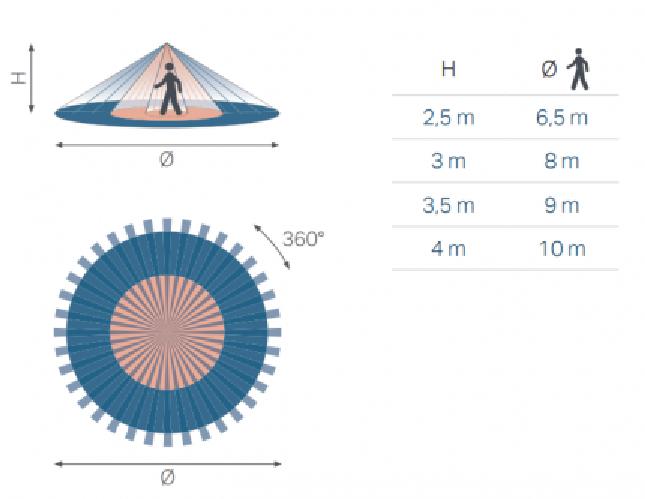 Die Reichweite der Bewegungserfassung des Infra Garde 360 AP Akustik-Bewegungsmelders beträgt bei einer Montagehöhe von 4m bis zu 10m im Durchmesser. Er wird Aufputz montiert.