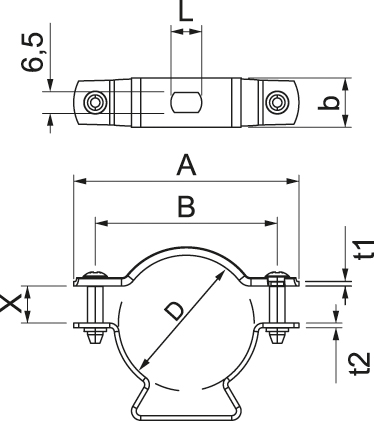 Abstandschelle zur Montage von Rohren und Kabeln an Wand, Decke und Boden. Mit selbstsicherndem Oberteil. Befestigung über Langloch.