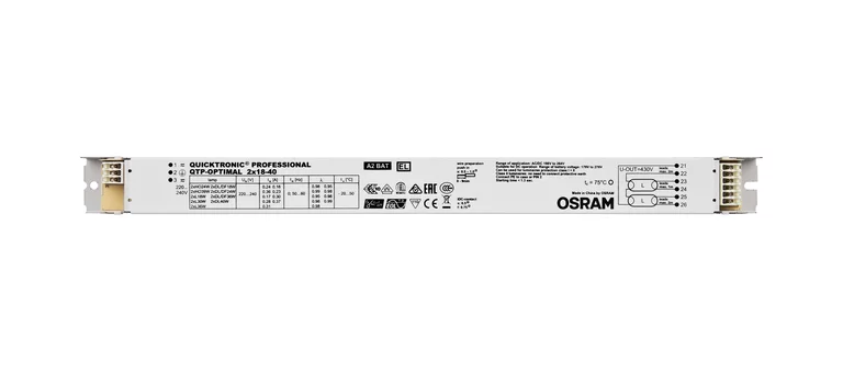 Das 2-kanälige elektronische Vorschaltgerät für TC-L/F, T5- und T8-Leuchtmittel QTP-OPTIMAL 2X18-40 aus der QUICKTRONIC PROFESSIONAL OPTIMAL-Reihe von OSRAM ist für den Einbau in Leuchten der Schutzklasse I und II geeignet. Die maximale Nennleistung beträgt 40 Watt.
