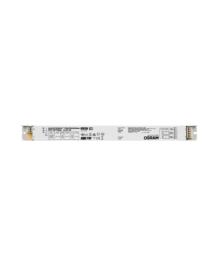 Das 2-kanälige elektronische Vorschaltgerät für TC-L, T5- und T8-Leuchtmittel QTP-OPTIMAL 2X54-58 aus der QUICKTRONIC PROFESSIONAL OPTIMAL-Reihe von OSRAM ist für den Einbau in Leuchten der Schutzklasse I und II geeignet. Die maximale Nennleistung beträgt 58 Watt.