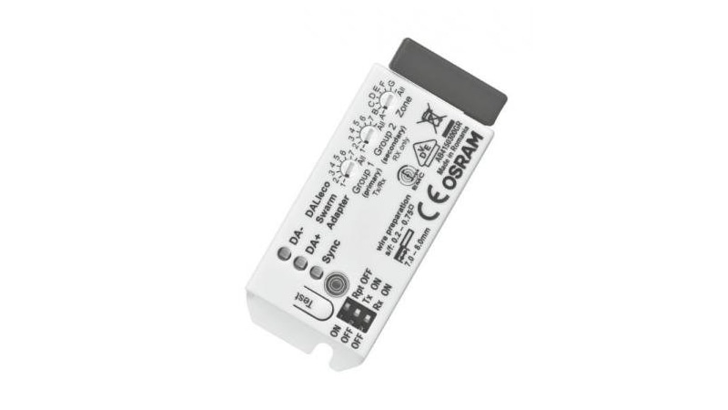 Mit dem 868 MHz DALI-Funkadapter DALIECO SWARM ADAPTER von OSRAM können Sie DALIeco-Steuergeräte drahtlos synchronisieren und Bewegungssignale sowie zentrale Ein-/Aus-Befehle bidrektional übertragen. Die Konfiguration erfolgt ganz einfach per Schraubendreher. Ideale Anwendungsgebiete sind zum Beispiel Büroräume und Korridore.
