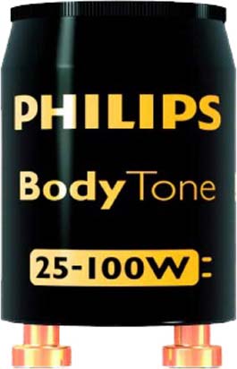 Glimm Starter, Einzelschaltung, Betrieb mit 220-240V, der BodyTone Solarium Starter 25-100W zeichnet sich durch eine sichere und zuverlässige Zündung Ihrer 25 bis 100 Watt starken Solariumröhren aus. Der Starter wurde für ein häufiges An- und Ausschalten von Solariumröhren entwickelt. Durch die besonders lange Lebensdauer die etwa bei 6000 Zyklen also ungefähr 1500 Betriebsstunden liegt, halten Solariumröhren bis zu 25% länger. Dieser Glimm-Starter lässt Ihre Solariumröhren in vollem Licht erstrahlen. Die umweltfreundlich entwickelten Starter überzeugen auch in der Sicherheit, die durch flammenhemmendes und UV-beständiges Gehäuse gewährleistet wird. Bei jedem Austausch der Leuchtstofflampen sollten auch die Starter gewechselt werden. Das Wechseln der Starter wurde durch das Click & Switch-System um ein vielfaches vereinfacht. Die Aussparungen am Kopfstück des 25-100W Starters ermöglichen ein einfaches herausdrehen des alten Starters. Energieeffizienzklasse: nicht kennzeichnungspflichtig