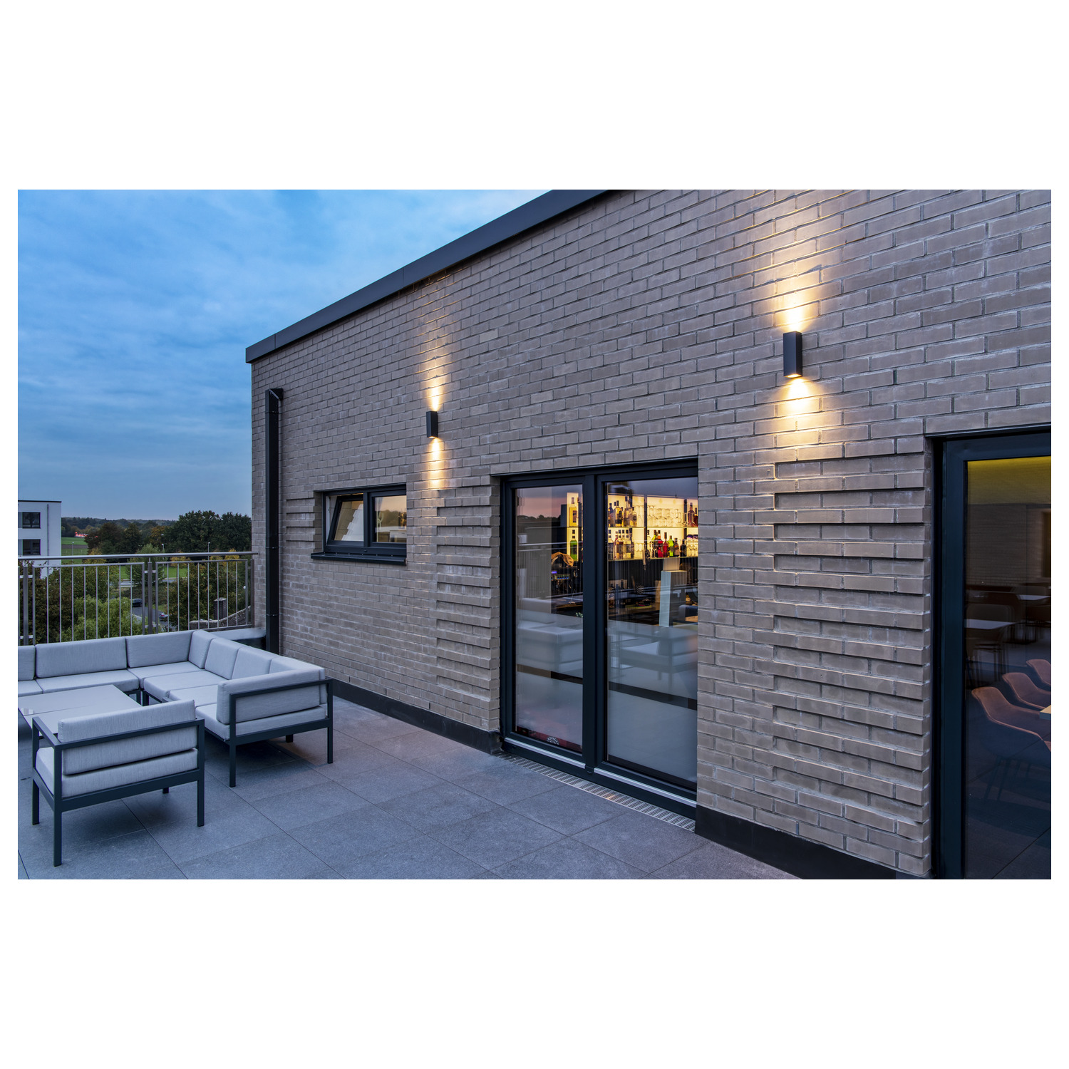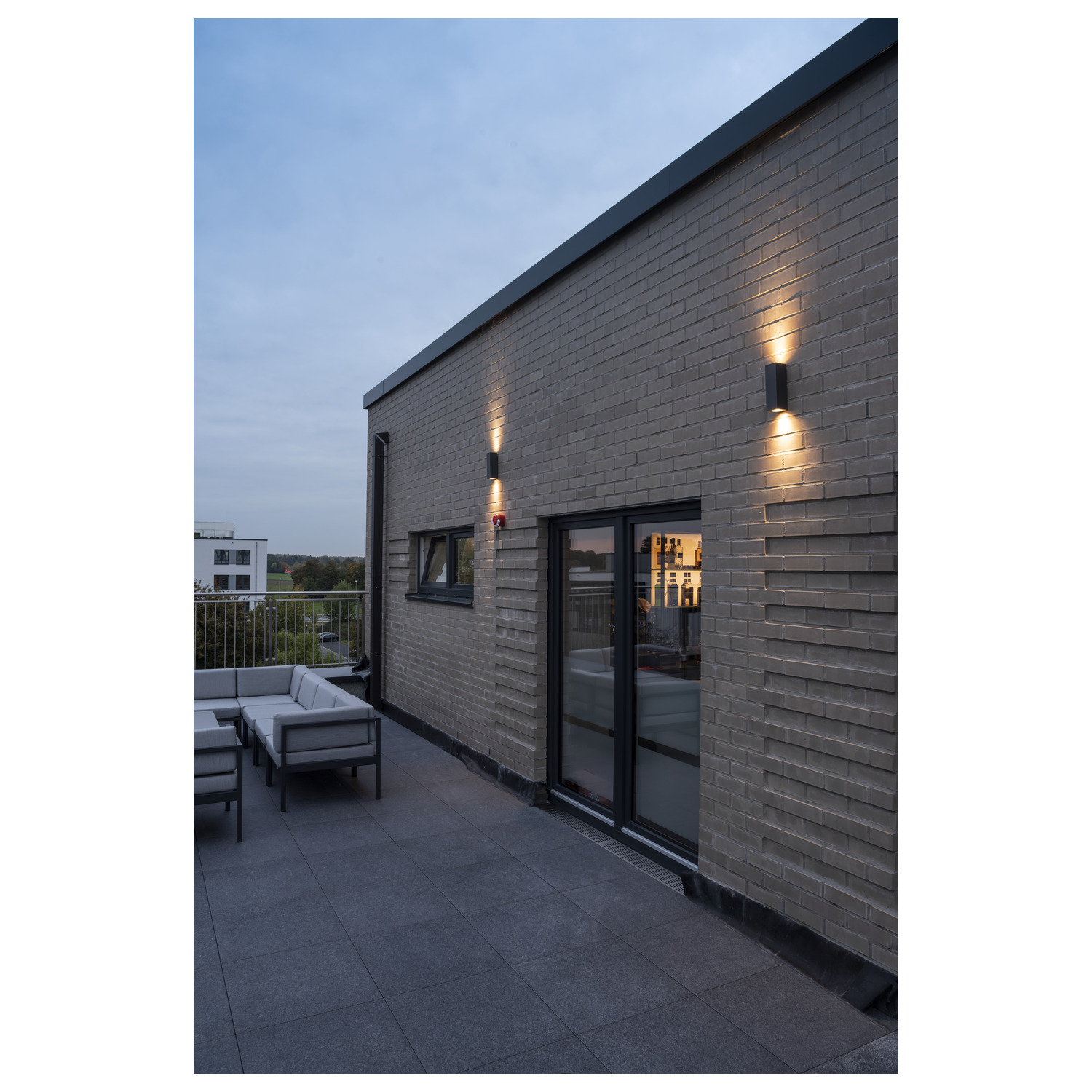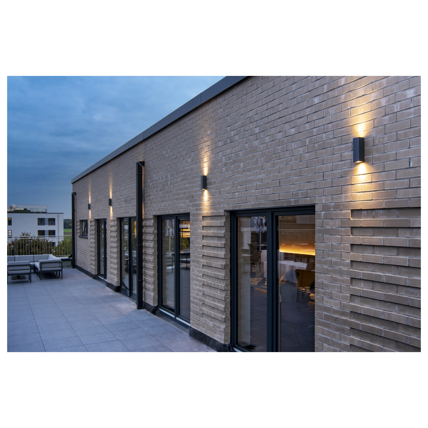 Wandleuchte der THEO Serie gefertigt aus Aluminium und Glas welches die Leuchtmittel abdeckt. Dank der Position der zwei verbauten Fassungen, erzeugt die montierte Leuchte zwei gleiche, jedoch entgegengesetzte Lichtkegel (UP/DOWN). Durch die Schutzart IP44 ist sie für den Außenbereich geeignet. Der elektrische Anschluss der in drei Farbversionen verfügbaren Leuchte erfolgt an 230V Netzspannung. Die THEO Serie beinhaltet des Weiteren Deckenleuchten und ist somit universell einsetzbar.