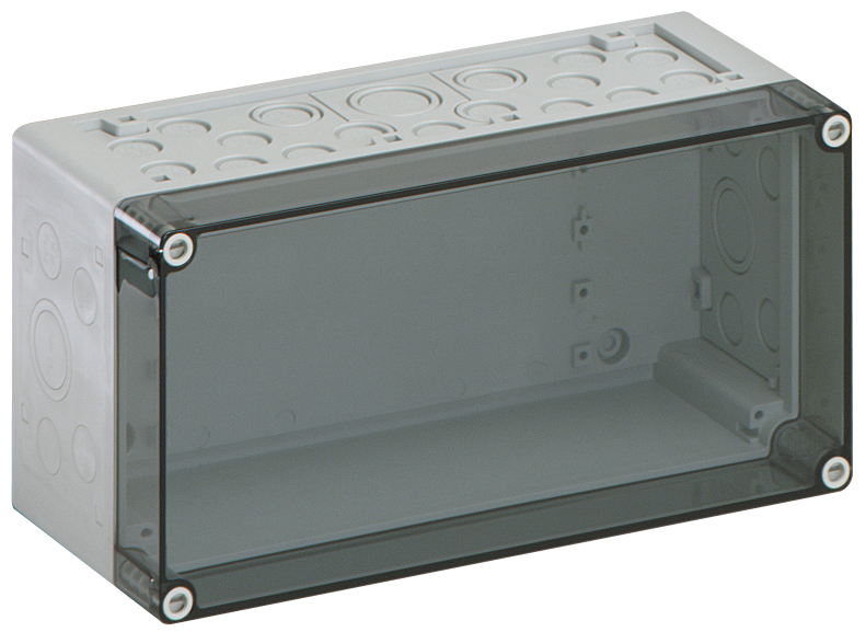 Leergehäuse, mit Schutzart IP65, Polystyrol, Ui=690V AC, Ui=1000V DC, innenliegende Befestigungsstellen, für Standardinstallationen im Innenbereich, Kasten: Polystyrol, Deckel: Polycarbonat, transparent, Ausschlagmembranen, M20/M25/M32/M40, (46 seitlich)Abmessungen: 300 x 150 x 132mmBeigefügtes Zubehör: 10 Doppelmembranstutzen IP66 M20 Dichtbereich 7-12mm, 2 Doppelmembranstutzen IP66 M25 Dichtbereich 9-16mm, 2 Doppelmembranstutzen M32 Dichtbereich 14-21mm, 1 Doppelmembranstutzen IP66 M40 Dichtbereich 19-28mm