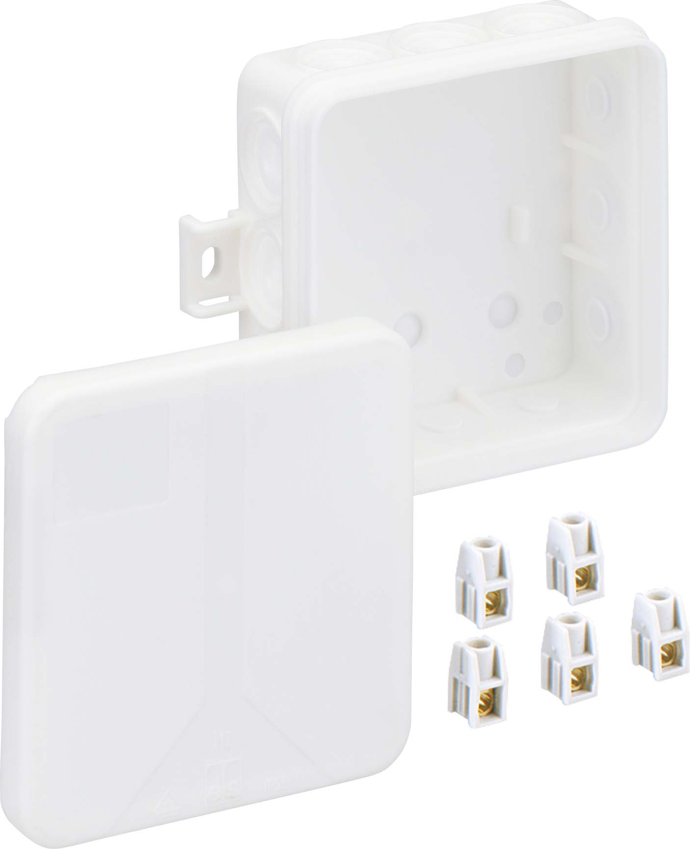 Verbindungsdose, mit Schutzart IP55, Nennquerschnitt 2,5mm², Ui=400V AC, zertifiziert nach VDE (DIN EN 60670-1/-22 (VDE 0606-1/-22)), selbstdichtende Einführungsmembranen, Dichtbereich 8,2-12,5mm, (3 rückseitig, 12 seitlich), innenliegende Befestigungsstellen, für Standardinstallationen im Innenbereich, weiß, mit 5 aneinanderreihbaren Schraubklemmen 2,5mm² (5 x1² / 5 x 1,5² / 3 x 2,5²)