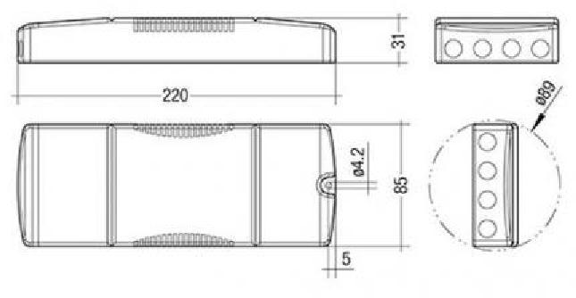 Das Gehäuse des Konstantstrom-LED-Treibers ist aus weißem Polycarbonat gefertigt und IP20-geschützt. Für eine einfache Verdrahtung sind 45° Steckklemmen vorhanden.