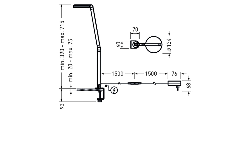 Leuchtenhöhe (stufenlos einstellbar) 390 mm - 715 mm. Gewicht: 1,4 kg. Schutzklasse (EN 61140): II, Schutzart (DIN EN 60529): IP20, Stoßfestigkeitsgrad nach