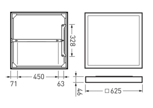 Leuchtenkörper aus Aluminium. Oberfläche weiß beschichtet (RAL 9016). Maße (L x B): 625 mm x 625 mm, Leuchtenhöhe 46 mm. Schutzklasse (EN 61140): II, Schutzart (DIN EN 60529): IP20, Stoßfestigkeitsgrad nach IEC 62262: IK02, Prüftemperatur Glühdrahttest gemäß IEC 60695-2-11: 650 °C. Gewicht: 2,8 kg.