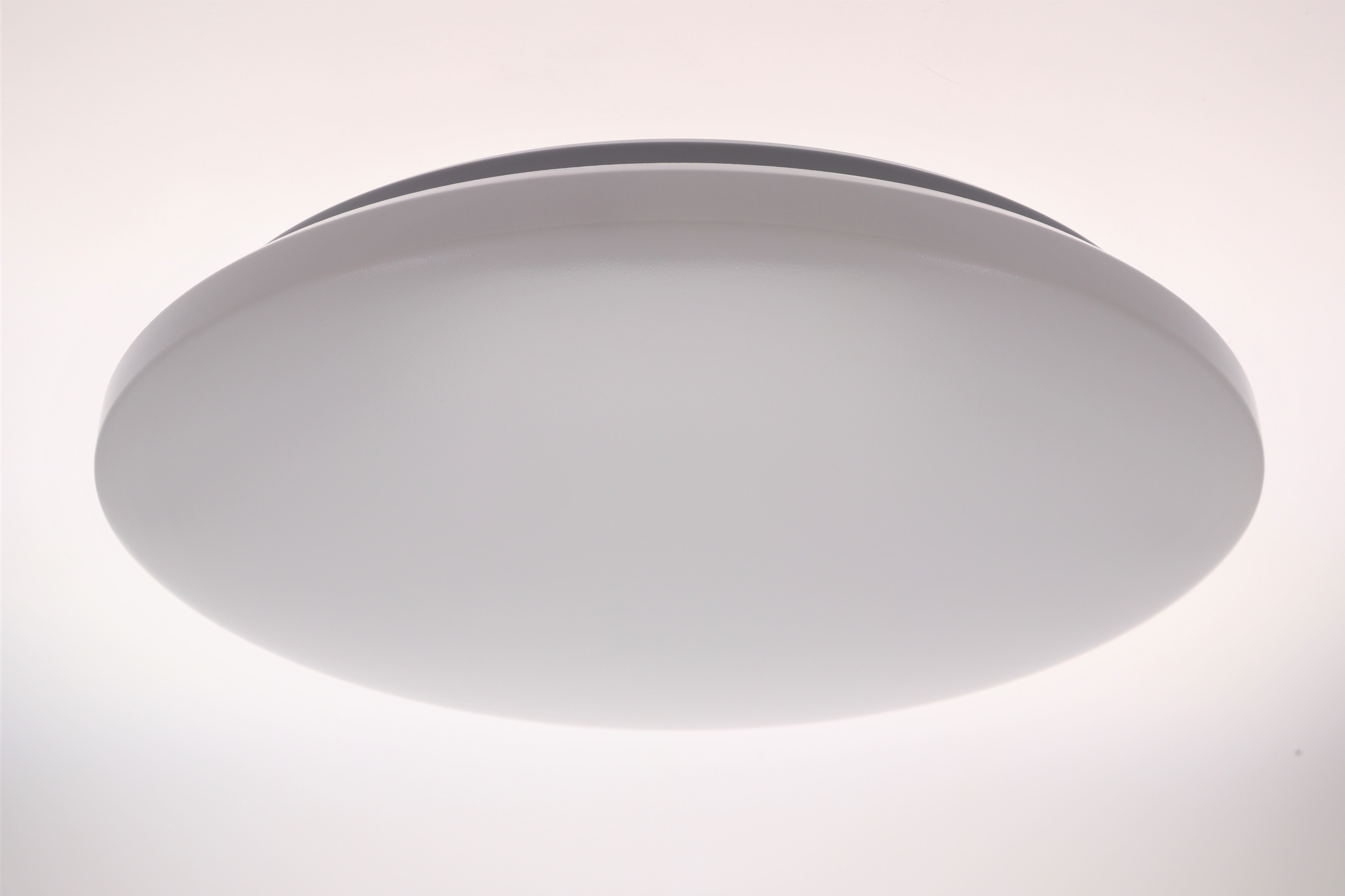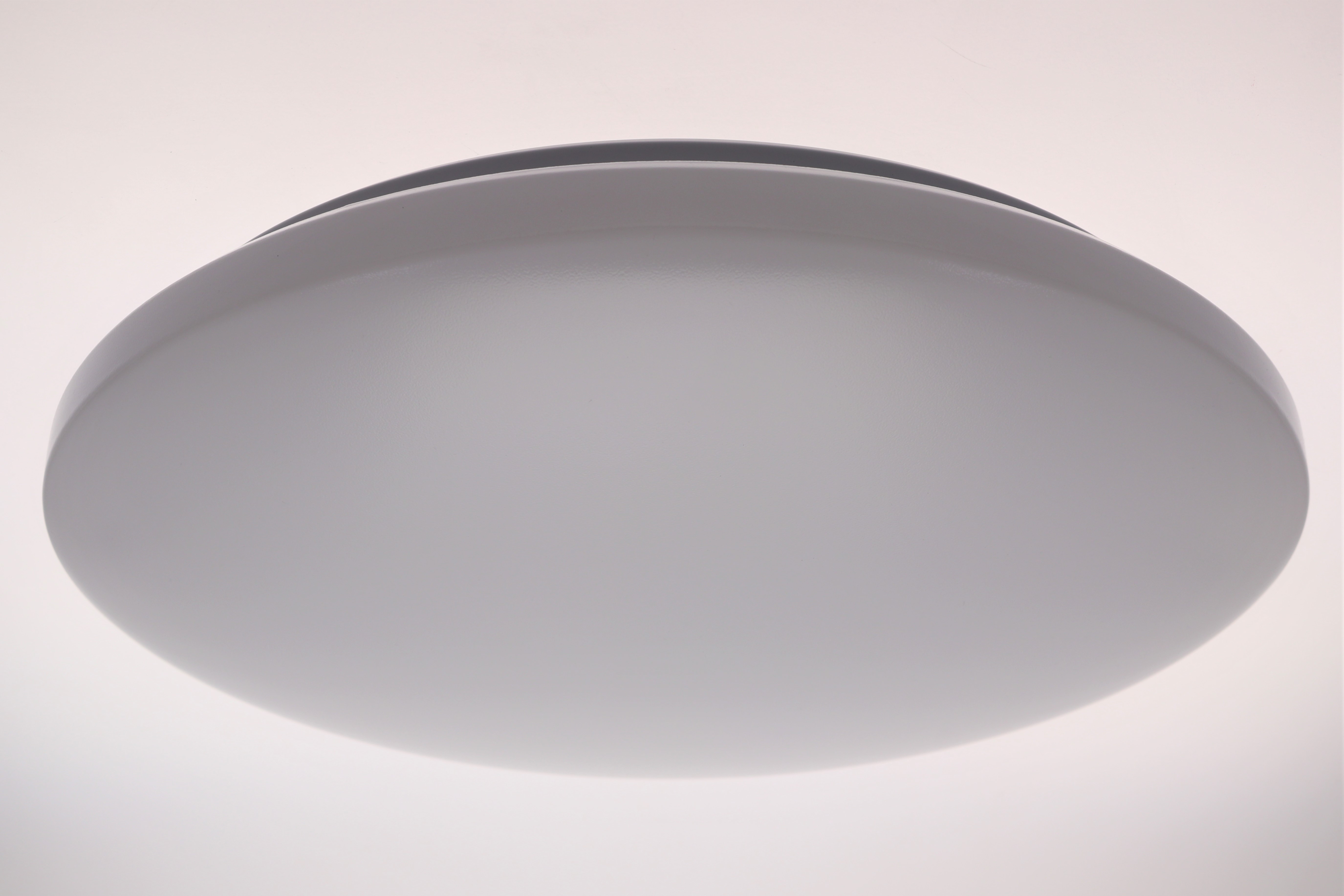 Die Leuchte besitzt eine opale PC-Abdeckwanne mit lambertscher Lichtstärkeverteilung und Blendungs- bewertung nach UGR-Einstufung (EN 12464-1) <22. Einstellbarer Bemessungslichtstrom von 800 lm, 1400 lm oder 2200 lm. Die Bemessungsleistung ist abhängig von dem eingestellten Lichtstrom (7 W / 18 W). Die Leuchten-Lichtausbeute beträgt 107 lm/W in einer warmweißen Lichtfarbe (Ähnlichste Farbtemperatur CCT = 3000 K).