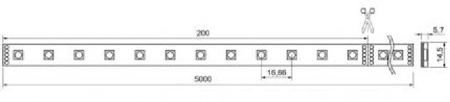 Das LED-Tape ist 5 m lang und 14,5 mm breit. Auf der Rückseite befindet sich 3M-Klebeband. Alle 20 cm besteht eine Schneidemöglichkeit, sodass sie von voller Flexibilität in der Anwendung profitieren. Beim Schneiden und erneut Verbinden muss die Dichtigkeit durch Silikon wiederhergestellt werden.